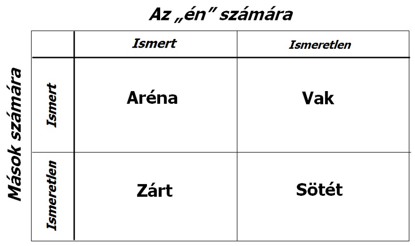 Aréna: Azok a tulajdonságok tartoznak ide, amelyeket mi is tudunk magunkról, és mások számára is nyilvánvaló. Minél tágabb ez a rész, annál mélyebb az önismeretünk.