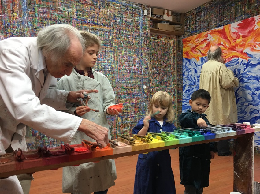 Ahogy a korábbi beszámoló részekben már többször említettem, Arno Stern Festőhelyén ezeket az elementáris folyamatokat gyakorolhatjuk „kicsiben” és egy védett térben. Mit jelent ez a Festőhelyen? Azt, hogy a festők alkotnak, Arno pedig szolgál. Folyamatosan és mélyen figyel, szinte őrzi a teret, hogy az alkotás folyamata minden résztvevő számára minél zavartalanabb legyen. Ha a festőnek új lapra van szüksége, azonnal ott terem, és abba az irányba bővíti a teret, amelyben az alkotó vágyat érez. Ha lecsöppen a festék, akkor egy precíz mozdulattal eltávolítja. Ha szükséges, sámlit tol az alkotó alá, hogy mindig biztonságos és kényelmes helyzetben tudjon festeni. Ha már nincs szükség a sámlira, akkor észrevétlenül félrevarázsolja azt. Ha vízre van szüksége, akkor cseppenként adagol neki a gondosan előkészített speciális üvegcséből. Ha színeket szeretne keverni, akkor előkészíti a keverőtálkát, az ecsetet és kiadagolja a kívánt színeket. Ha valaki egy számára még ismeretlen színt szeretne keverni, akkor segít annak pontos kikeverésében… addig adagolva a színeket, amíg a résztvevő szeme fel nem csillan: „Igen, erre gondoltam!”. Ha valaki ujjal festett és ezt befejezettnek tekinti, gyengéden lekapargatja a festéket az ujjakról, hogy tiszta kézzel nyúlhasson az ecsethez.